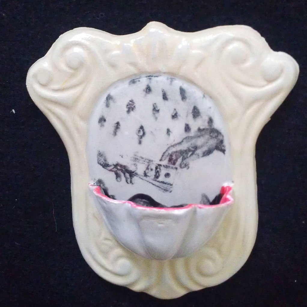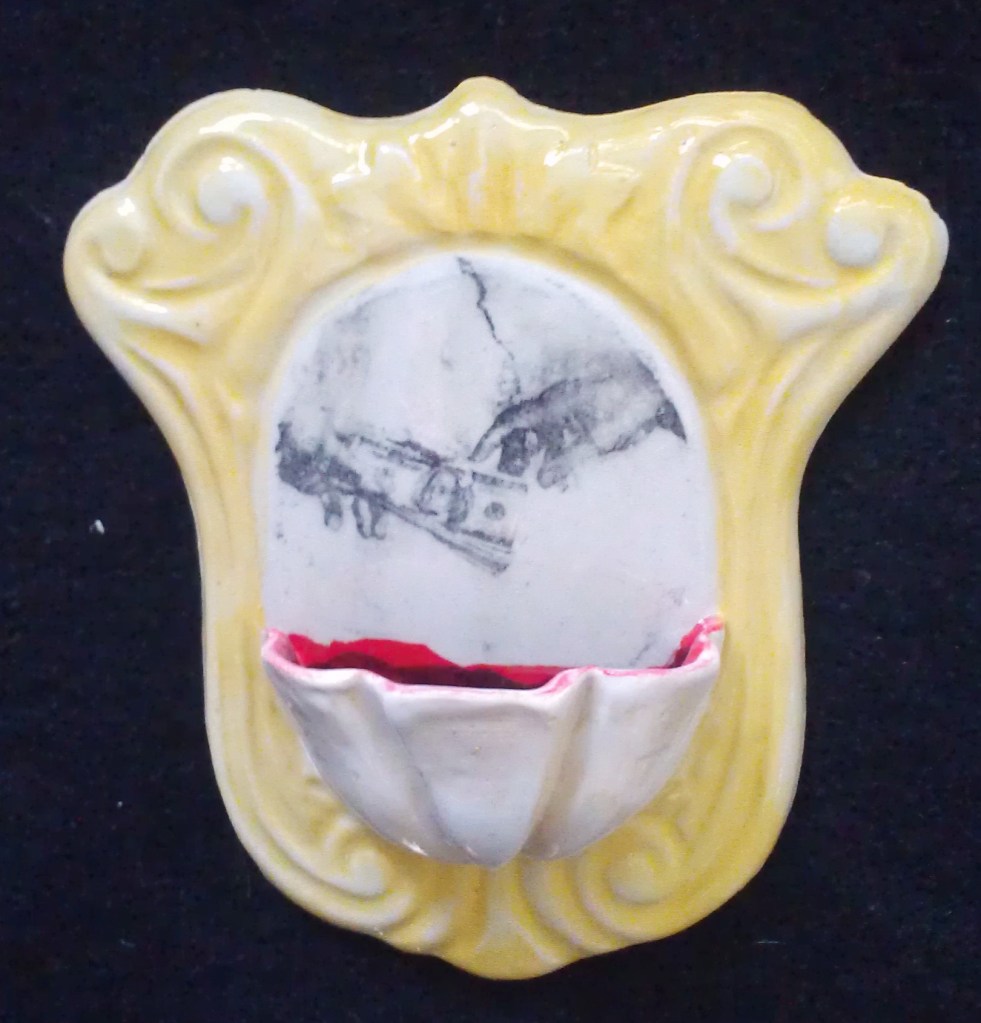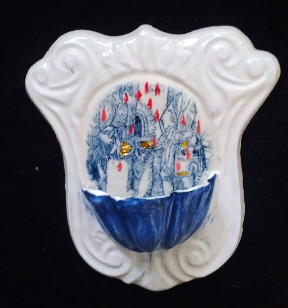 Created for the “Cash Money” exhibition at the Hundreddollargallery, the series of holy water fountains references Dante’s Circles of Hell and illustrates, among other things, how the usurers are showered with tongues of fire, their money bags weighing heavily around their necks.