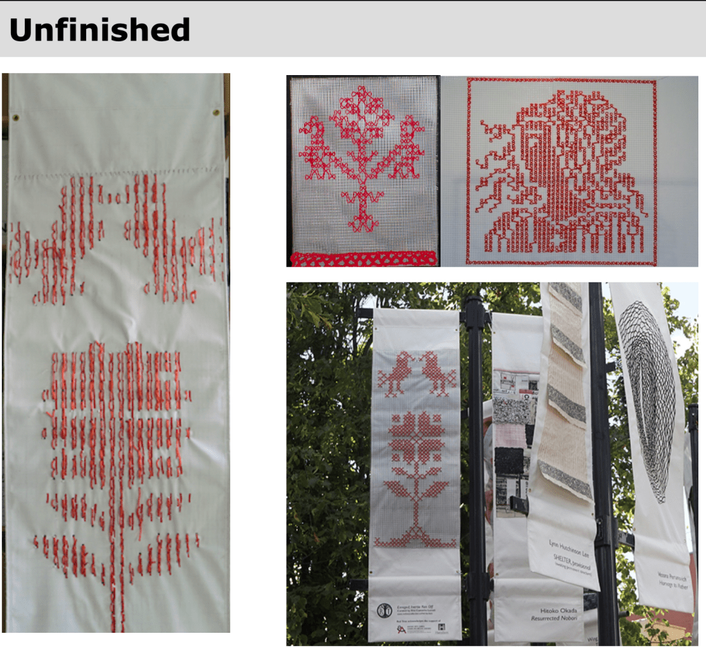 My embroidery, knitting and crochet work with construction materials and other non-traditional substrates builds on an earlier body of work dealing with concepts of domestic and social order. My grandmother’s embroidered wall hangings all contained text and images that proclaimed the virtues of good housekeeping. The symbolism in traditional Germanic cross-stitch embroidery is laden with messages that resonate with social control. While the original imagery of the tree of life is pre-Christian (evident in the acorn, stags, roosters, etc.), recent patterns feature catholic and imperial symbols (cross, crown, anchor, key, etc.) patriarchal institutions of church and state impose oppressive rules on women; yet, rural women in many European countries continue to embroider symbols of those powers on tablecloths, towels and pillows.